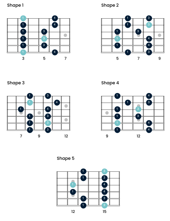 The main thing to watch out for here is that your fingering doesn’t get mixed as you transition from one shape of the scale to the next. Take the shift from shape 1 to shape 2 as an example. Depending on how you finger the top of shape 2, you may need to make a small adjustment as you arrive at that position.